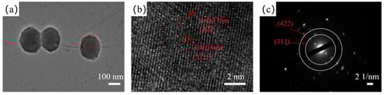 The morphology and structure of the CoFe2O4/SWCNTs composites were further characterized by TEM, and the results are shown in Figure 4. As can be observed from Figure 4a, the CoFe2O4 microspheres with diameters of about 100–200 nm are uniformly anchored on SWCNTs, and the necklace-like structure of the composite is consistent with the SEM image. In addition, the HRTEM image of Figure 4b shows a lattice spacing of about 0.25 nm and 0.17 nm, which is attributed to the (311) and (422) crystal plane of spinel cobalt ferrite, further confirming the presence of CoFe2O4. The SAED pattern of Figure 4c reveals the polycrystalline structure of the CoFe2O4/SWCNTs composite.