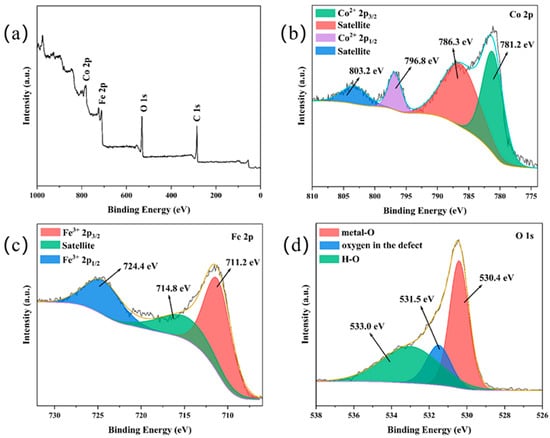 To further investigate the chemical composition and bonding of the CoFe2O4/SWCNTs composites, XPS characterization was performed, as shown in Figure 5. All binding energies were normalized concerning C 1s at 284.8 eV. It can be clearly observed from the full spectrum in Figure 5a that there are four elements present, Co, Fe, O, and C, respectively. Figure 5b demonstrates the high-resolution Co 2p spectra, where the peaks at 781.2 eV and 796.8 eV are attributed to the Co2+ 2p3/2 and Co2+ 2p1/2 spectra, respectively [39,40]. The double-peaked signals at about 786.3 eV and 803.2 eV are assigned to the two oscillating satellites. Thus, the high-resolution XPS spectra of Co 2p indicate the presence of Co2+ ions. The Fe 2p spectra of the CoFe2O4/SWCNTs composites are shown in Figure 5c. The peaks at 724.4 and 711.2 eV correspond to the binding energies of Fe3+ 2p1/2 and Fe3+ 2p3/2, respectively, with the oscillating satellites located at 714.8 eV [41]. The detected Co 2p and Fe 2p photoelectron peaks are consistent with the reported peaks of Co2+ and Fe3+ in CoFe2O4. In Figure 5d, the O 1s spectrum is divided into three parts. The peak at 533.0 eV can be attributed to the adsorbed water. The two peaks located at 531.5 and 530.4 eV are consistent with oxygen in the defect and metal-oxygen bonds, respectively [42].