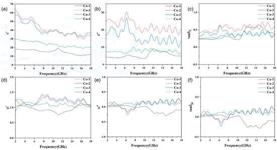 Electromagnetic parameters of Co-1, Co-2, Co-3, Co-4: (a) , (b) , (c) dielectric loss angle tangent factor tan, (d) , (e) , (f) magnetic loss angle tangent factor tan.