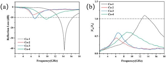 From Figure 8a, we can see that with a coating thickness of 1.5 mm, the absorption effect of the Co-1 sample is better, and the peak value of reflection loss reaches −42.07 dB at near 14 GHz. With the increase in cobalt salt addition, the value of reflection loss is −42.07 dB, −7.50 dB, −11.27 dB, and −11.81 dB, and the absorption performance appears to decrease at first and then increase. With the increase in CoFe2O4 content, the effective absorption band of the samples shifted to low frequencies, then to high frequencies, when the Co-2 sample reached the lowest frequencies. The results indicate that the CoFe2O4/SWCNTs composites can exhibit excellent microwave absorption performance only when the component ratio is appropriate. The closer the impedance matching Z is to 1, the more the incident wave propagates in the absorbing medium and the better the absorption performance. As can be seen in Figure 8b, Co-1 is closest to 1, so it has the best wave absorption performance.