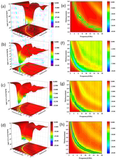 To further visualize the comparative observation of the absorption capacity of the four samples, three-dimensional plots and contour plots of the relationship between reflection loss, frequency, and sample thickness were drawn, as shown in Figure 9.