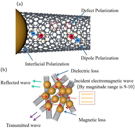Schematic illustration of EM wave absorption mechanisms for CoFe2O4/SWCNTs composites: (a) relaxation loss; (b) absorbing mechanism.