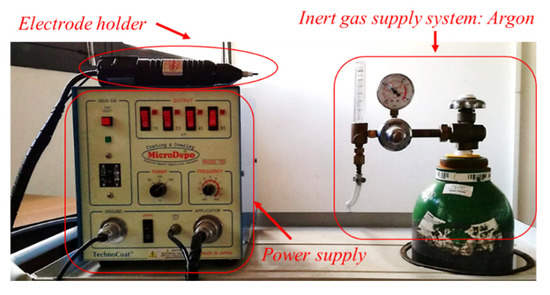 The electrospark deposition equipment is essentially composed of two main components: a capacitor-based power supply and an electrode holder (also known as applicator or torch) [27,62]. The most common power supply consists of a current rectifier, which transforms alternating current into direct current (DC) needed to charge up a series of capacitors and the discharge circuit. To discharge the capacitors, the power supply uses a resistor–capacitor (RC) or a microprocessor-controlled discharging circuit [27,62]. The electrode, controlled by the torch, is connected to the positive pole of the capacitance bank, while the workpiece (substrate) is connected to the negative one [32,52,62]. The electrical circuit between the electrode and the workpiece is completed by an electrical ground cable fixed to the workpiece [27]. Figure 1 shows the equipment for the electrospark deposition. Moreover, an inert gas supply system is added to the electrode holder to allow a cover gas to flow over the deposition site at all times. Generally, the shielding gases used are: argon, helium, carbon dioxide, and mixtures of these gases. The inert gas protects the deposited metal from oxidation, provides cooling, and affects the physical properties of the arc, thereby also affecting the characteristics of the deposit [62].