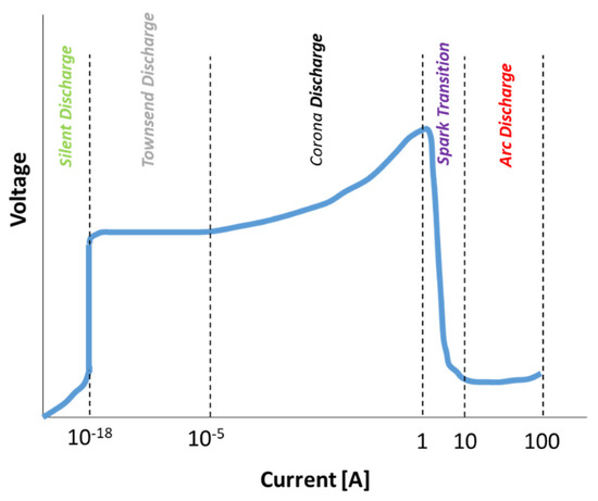 Figure 2. Representation of tension–current behavior of stationary electrical discharge in gas at atmospheric pressure [26].