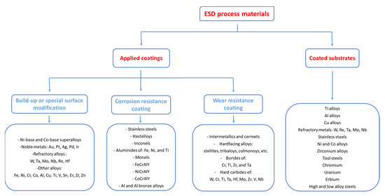 Figure 3. Chart of applied coatings and alloys of ESD-coated substrates to date. Adapted from [70].