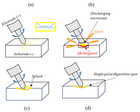 Over the years, many researchers have advanced different hypotheses on the material transfer mechanism from the rotating electrode to the substrate during the electrospark process [48,67,71]. However, the heuristic physical model proposed by Liu et al. [69] to explain the mechanism of the transferred material was the most widely accepted. Figure 4 shows the scheme of the proposed physical model. In this model, the process is divided into four stages. Initially, the rotating electrode is shifted until the tip touches the substrate locally (1° stage, Figure 4a). Immediately after (2° stage), a pulsed electrostatic discharge is generated between the electrode tip and the substrate. The large amount of energy and current provided by the discharge rapidly leads to the melting and gasification of both the electrode material and a small amount of the substrate material. In particular, at this second stage, there is the generation of a melted pool on the substrate and small melted droplets of electrode material (Figure 4b). Furthermore, it has been found that the heat input is able to improve the ionization of the gas present between the substrate and the rotating electrode. High temperatures and pressures are generated in the contact microzone (Figure 4b,c). Subsequently, thanks to the rotation of the electrode, the melted drop formed is rapidly propelled towards the melting pool; here, it impinges on the substrate and solidifies rapidly (Figure 4c) [19,69]. Due to the small melt thickness and the high heat transfer rate among the substrate and the melt, or even the previous deposit, it can be assumed that the temperature gradient, the solidification rate, and the cooling rate are constant at all times inside the single deposit and perpendicular to the surface of the substrate [24]. At the end in the fourth stage, a new discharge cycle will take place as the substrate and electrode come into contact again (Figure 4d).