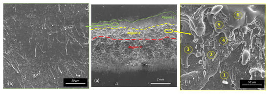Figure 5. (a) SEM micrograph showing the deposition track of NI6625 (Inconel 625) upon Inconel 738 substrate with variables of 25 volt, 400 Hz, and rotating electrode of 600 rpm using argon; (b) SEM micrograph of region 1 at higher magnification showing the splashes produced by the impact of the drops following the direction imposed by the electric discharge; and (c) SEM micrograph of the deposition in region 2 at higher magnification showing the six overlapping layers. Adapted from [39].