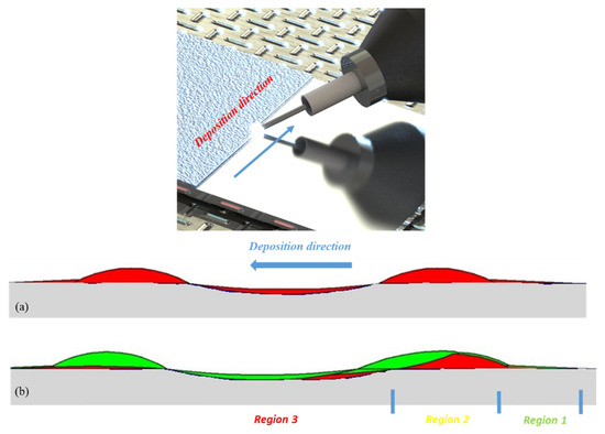 Figure 6 shows the representative drawing of the single spark effect on the cross section during the movement of the electrode towards the left and what happens when a second drop is generated. The heat produced by the discharge of the electric spark evaporates and expands a small amount of material, causing a very high local pressure; consequently, the liquid pool will splash into the surrounding and solidify due to the heat absorbed by the lower substrate (Figure 6a). It is noteworthy that at the point where the electrode material is mixed with the base material, the surface takes the form of a forward bent arc (region 3). At the same time, some drops will tend to fly away and impact in more distant areas together with the vapors, thus creating region 1 (Figure 6a). When the second electrical discharge occurs, the heat produced generates evaporation and melts the previously deposited material together with a small amount of substrate, bonding with the new molten electrode material, which is diluted from the old deposited layer. Therefore, the new material contains about 60% of the electrode and 40% of the prior deposited layer (see the green area in the drawing, Figure 6b). Figure 6b shows how the advancement of the electrode determines the geometry of the subsequent deposits [39].