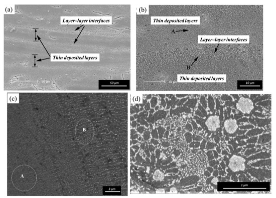 In the literature, several studies show the ability of the electrospark technology to obtain a material coating with a highly refined microstructure by depositing both homologous and dissimilar electrode materials to the substrate. For example, Figure 8a–d shows the morphology and microstructural changes that occur in Al-based alloy coatings as a consequence of rapid solidification [20,30,33]. It is worthy of note that coatings consist of many superimposed thin layers. The layered structure is depicted in Figure 8a, where both some layer–layer interfaces and one single deposited layer are also indicated by arrows. The subsequent superimposed layers and the first one to be deposited on the substrate are bonded by metallurgical reaction, such as diffusion or fusion [11,20]. As it can be observed in Figure 8b,c, the most frequent morphologies related to the ESD process are equiaxed dendritic or cellular dendrite morphology. Specifically, the layer–layer interfaces are generally characterized by the presence of equiaxed dendrites (indicated by the arrow B in Figure 8b), while the different layers are characterized by the presence of a cellular dendritic microstructure (indicated by arrow A in Figure 8b). Generally, the microstructural morphology and scale within the coating are nonuniform but highly variable due to the different local solidification conditions induced by the deposition process. A study on high gamma prime superalloy IN-792 coating deposited showed that the typical cellular microstructure grows antiparallel to the heat flux direction [24]. In addition, Y. Xie et al. pointed out that in the deposited layers, grains grow vertically passing through layers and form long columnar grains with a preferential growth orientation along the buildup direction [24].