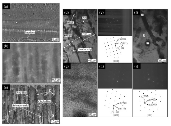 Wang Mao-cai et al. [79] investigated using SEM and TEM the microstructural characteristics of a NiCoCrAlYTa coating epitaxially built-up on a directionally solidified (DS) Ni-based superalloy blade tip by ESD. They showed that the coating consists of the overlap of several layers. In particular, the built-up coating exhibits zones characterized by the presence of microstructures, such as cellular dendrites and very fine columnar dendrites and transition zones. More specifically, the layer consists of γ-dendrites and β-precipitated particles. It has been observed that the precipitation and growth of the latter occur along the γ dendrite (Figure 10a–c). In Figure 10c, the precipitates forming in front of the cellular columns can be clearly seen. The presence of the precipitates not only prevents the growth of the cellular columns (indicated as “S”), but in addition, if they are coarse, they also affect the direction of the growth of these with respect to their original orientation (indicated as “C”). Furthermore, in the TEM image in Figure 10d, four parallel strips of bamboo-shaped structure can be observed. This structure basically consists of rod-shaped particles having different lengths. Intervals between these strips were measured and appear to be in the range of approximately 800–1200 nm. Figure 10e shows the electrobeam diffraction pattern performed on the bamboo-shaped dendrite for the NiCoCrAlYTa ESD coating. It was observed that the bamboo-shaped dendrite exhibits the characteristics of β (i.e., a BCC crystalline phase). The high-magnification TEM images clearly highlight the existence of the nanoparticles between two bamboo-like dendrites (Figure 10f,g). These nanoparticles have been identified as a BCC structure, or β phase (Figure 10h). Furthermore, in Figure 10g, it can be observed that the γ phase has a homogeneous cellular substructure of approximately 6 nm inside which some bright white particles are randomly distributed. The bright white particles can be γ’ phases. Meanwhile, from the diffraction pattern reported in Figure 10i, it was observed that the matrix has an FCC structure, which is a γ phase (zone B in Figure 10f) [79].