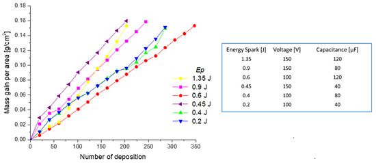 Cao et al. [48] showed for the NiCrAlY coatings deposited on the GH4169 superalloy that different mass gain values were obtained by varying the process parameters (voltage and capacitance). Figure 11 shows the mass gain curves as a function of the number of passes for different values of spark energy Ep. The results presented in Figure 11 show that the mass gain, for the same area and the same deposition time, grows linearly as the number of depositions performed increases. More specifically, they observed that mass gain increases more rapidly with increasing voltage, while the opposite trend was found as capacitance increases (i.e., mass gain decreases as capacitance increases). Finally, it was found that high capacitance values generate a less regular splash pattern and a deposit with a greater presence of defects, thus obtaining a lower mass gain value [49,77].