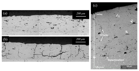 Many studies have reported that the shortcomings of electrospark coatings include both a high concentration of defects, such as voids and microcracks, and a high surface roughness. It is well known that the microcracks and voids drastically reduce the resistance of the deposit, while the roughness can represent a real advantage for certain types of application (Figure 12a–c). The typical voids identified within the coating are of three types and are indicated by arrows in Figure 12c: spherical-shaped defects (n°1), random-shaped defects (n° 2), and laminar defects (n° 3). The latter, identified as cracks, can extend through all the deposit both parallel and perpendicular to the substrate/coating interface. It was found that the formation of the first two types of defects (i.e., spherical- and random-shaped defects) depends substantially on the amount of material brought to melting and its distribution [4,20,21,31,51]. Instead, the formation of laminar-shaped defects is mainly due to the thermal stresses generated by the high thermal gradients (G) typical of the electrospark process. More specifically, the cracks that extend perpendicular to the interface are due to the shrinkage that occurs during the solidification and cooling of the deposited material. It was observed that very often these cracks were generated in the very first deposited layers, but they can also originate in subsequent layers and nuclear on the random shape defects present within the deposits [51,80]. In addition, it was found that the perpendicular cracks that were generated in the first deposited layers very often propagate upward through the entire thickness. This is due to the repeated thermal stresses to which the coating is subjected for the entire duration of the construction of the deposit [20,21]. Unlike perpendicular cracks, those that extend instead parallel to the interface are most often generated by poor mixing of the electrode material with the substrate or previously deposited layer and can also originate from the mechanical impact of the electrode during its advancing. These are also known as delamination since they originate at cracks’ weakly bonded interfaces [51].