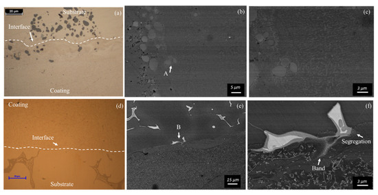 Figure 13. Microstructure close to the substrate/coating interface: (a) Optical micrograph and (b) scanning electron micrograph of A357-T61 coating deposited upon a homologous substrate [50], (c) magnification of the substrate/coating interface (indicated as “A” in Figure 13b, (d) OM and (e) SEM micrographs of WE43-T6 coating deposited upon a homologous substrate, (f) magnification of the substrate/coating interface (indicated as “B” in Figure 13e) [51].