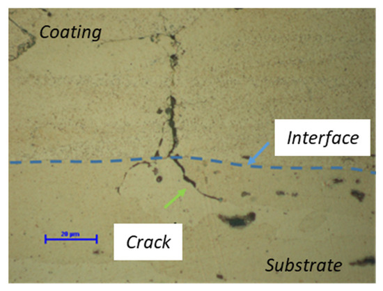 Some studies on depositing of the thermally sensitive materials, such as 2024 aluminum alloy deposited on a homologue substrate, report some critical changes in the substrate/coating interface. These effects occur in the form of cracks perpendicular to the substrate/coating interface, which extend into the substrate preferentially along the grain boundaries (see Figure 14). As it is known, the AA2024 alloy is susceptible to the formation of solidification cracks and/or liquation cracks during the welding processes, being characterized by large solidification range, high thermal expansion, large solidification shrinkage, and large quantity of alloying addition [20].