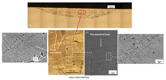 Figure 17. Optical and scanning electron micrograph of a microstructure parallel to the building direction: (a) cross-section macrograph of ESD deposit in AA2024-T4 on a homologous substrate; (b,c) several overlapping layers (morphology cross section); (d) long, slender columnar-like grains and within of the layers; and (e) fine microstructure to layer–layer interface due to the high cooling rate showing some layers characterized by a cellular dendritic microstructure (pointed by the circle B) and some other layers characterized by uniform distribution of fine small second-phase particles (appearing as light point in circle A). In addition, the layer–layer interface exhibited a coarse microstructure, generally equiaxed (pointed by box C) [21].
