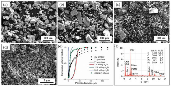 Figure 3. SEM micrographs of initial PbO·ZnO·P2O5 coarse powder (a), after milling in water for 7 h (b) 12 h (c) and 24 h (d); volume weighted cumulative size distributions for glass powders (e) (lines—obtained from SEM micrographs, scatter—obtained from laser diffraction) and typical EDX for coarse powder (f).