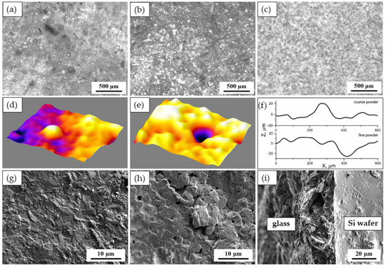 Figure 4. Morphology of fired PbO·ZnO·P2O5 glass layers. LM micrographs for the layers from (a) pure coarse powder, (b) with 2 wt.% graphite, (c) fine powder; the surface roughness maps for the layer from (d) coarse powder with 2 wt.% graphite, (e) fine powder layer and their z-profiles (f); SEM micrographs for the layer from (g) coarse powder, (h) fine powder layer top, and cross-section (i).