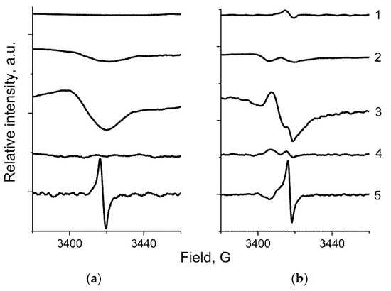 Figure 5. ESR spectra for fired PbO·ZnO·P2O5 coarse glass before (a) and after (b) 0.9 MGy γ-irradiation. 1—pure glass; 2—with 2 wt.% graphite PMM 11; 3—with 10 wt.% graphite PMM 11; 4—with 2 wt.% Cloisite 30B; 5—with 10 wt.% Cloisite 30B.
