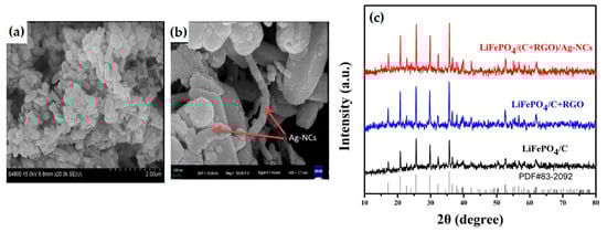 SEM images of LiFePO4/C (a) and LiFePO4/(C + rGO)/Ag-nanochains (b) and their XRD patterns (c) [61].
