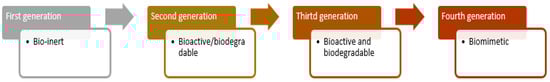This classification outlines the conceptual evolution of the requirements for implant materials. The major requirements pertaining to the first generation had been stiffness and the biological inertness of the materials. Implantation triggers the absorption of non-specific proteins on the surface of the material; a fibrous tissue capsule is formed, and the implant is encapsulated inside, which is a disadvantage for the implant [28]. This led to the design of the second generation of materials. For the second generation, which occurred between 1980 and 2000, the major requirements were the development of bio-absorbable and bioactive materials, while maintaining the mechanical properties of the implant [29,30]. A bio-absorbable material is able to degrade in a progressive manner, allowing the healing and regeneration of tissues. The bioactive material is designed to generate a layer of hydroxyapatite (HA), a natural component of the bone, on the surface of the material instead of the fibrous capsule. It is considered that in vivo stimulation of the production of a hydroxyapatite layer on the implant surface improves the process of mineralization, fixation, and bone regeneration [31,32]. The chemical attachment of various reactive groups on the surface of the polymer causes it to become bio-functional. Thus, this improvement by the second generation materials was possible by modifying the implant surface to promote specific cellular responses, instead of nonspecific responses, as was the case with the first generation [29]. The third generation of biomaterials orientate around the ability to trigger signals that stimulate specific cellular responses at the molecular level. These biomaterials are related to tissue engineering, regenerative medicine, tissue transplantation, and grafting. These biomaterials are designed to be temporary three-dimensional porous structures that are capable of stimulating tissue regeneration, nutrient supply, and possibly, angiogenesis [33,34]. The fourth generation of biomaterials elicits a personalized interaction with cellular processes and microenvironments, which includes four requirements: inertia, activity, receptivity, and autonomy [35].