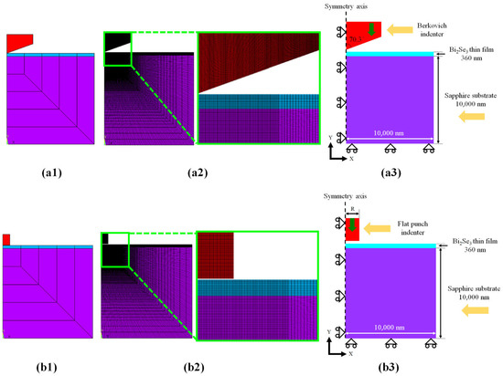 The entire specimen with (a1) Berkovich, (b1) flat punch and (c1) spherical indenters for the 2D model before meshing. Mesh of the entire specimen with (a2) Berkovich, (b2) flat punch and (c2) spherical indenters for the 2D model. The geometry, boundary, and load conditions of (a3) Berkovich, (b3) flat punch and (c3) spherical indenters.