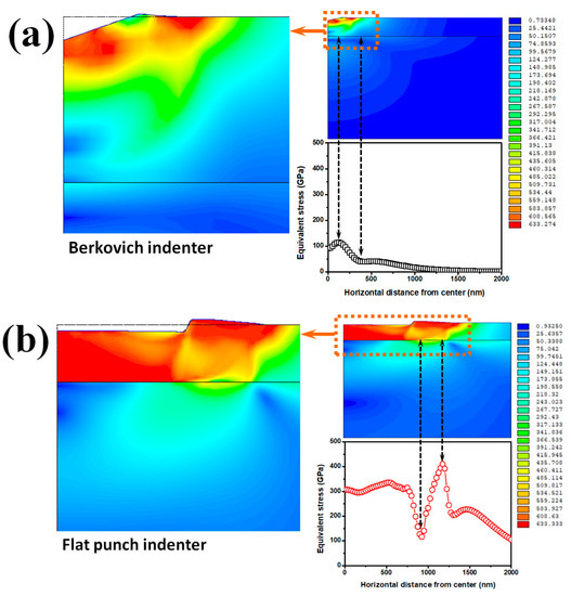 The pile-up event is often observed in systems consisting of soft film on hard substrate. For example, Tsui and Pharr [30] proposed that if the ratio of actual contact area and corner-to-corner area is greater than one, then the pile-up event can be observed, as illustrated in their experiment on an Al/glass system using a Berkovich indenter tip. A similar phenomenon was also observed in our experimental Bi2Se3 film/sapphire substrate [7]. It is interesting to note that the pile-up phenomena of modeled Bi2Se3 film/sapphire substrate can also be successfully replicated using FEM. On the other hand, it is evident that the residual stress within the Bi2Se3 film and/or the interface of Bi2Se3 film/sapphire substrate varies significantly with the geometry of the indenters (Figure 6).