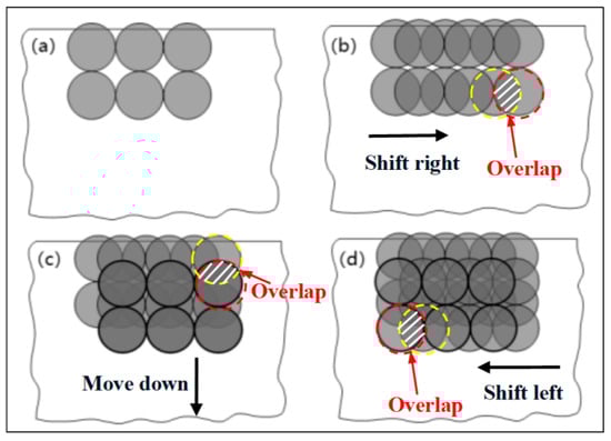 The laser shock was performed four times. Each laser shock area was treated with film (black tape) to ensure the effect of the laser shock. The spot distribution of the first laser shock is shown in Figure 2a, and the adjacent laser spots are tangent. The laser spot position of the second shock was shifted to the right, relative to the laser spot position of the first shock, and the amount of movement was the radius of the laser spot, as shown in Figure 2b. After that, the laser spot position of the third shock was moved down relative to the laser spot position of the second shock, as shown in Figure 2c. Finally, the laser spot was shifted to the left, relative to the last laser spot in Figure 2d, and the amount of movement still kept the radius of the laser spot.