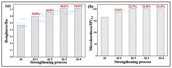 (a) Comparison of the roughness of the 7B04 aluminum alloy under different strengthening processes; (b) Comparison of the microhardness of the 7B04 aluminum alloy under different strengthening processes.