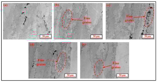 The grains are gradually refined because the increase in the laser power density will significantly impact the dislocation density and the moving speed during the deformation, enhancing the plastic deformation ability of the material [34]. As the number of movable dislocations increases, the material will undergo further plastic deformation. The presence of refined grains near the larger grains indicates that the introduction of a pulsed laser contributes to the dynamic recrystallization of the material.