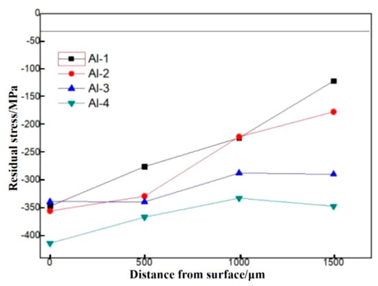 However, a slight decrease can be found in both the roughness and the microhardness for the Al-4 samples compared to the Al-3 samples. As the number of shock times exceeds three, the surface of the residual stress becomes more uniform and the roughness begins to decrease. The surface of the residual stress drops sharply for the Al-4 samples, and then the deformation energy and the degree of plastic deformation decline. The work-hardening effect is not apparent, which causes the microhardness of the Al-4 samples to be lower than that of the Al-3 samples.