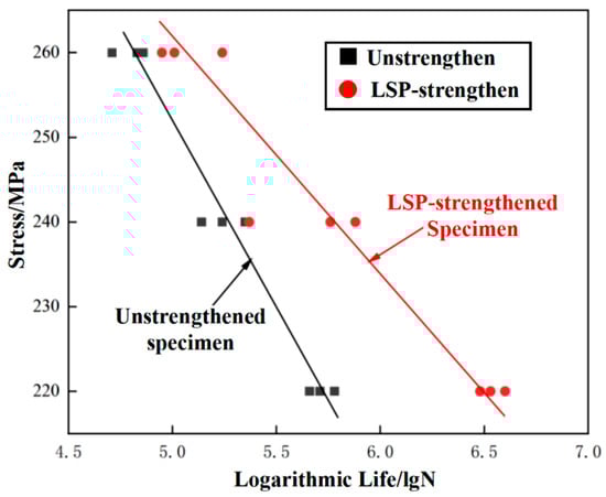 Figure 7 shows the S–N curves of the 7B04 aluminum alloy matrix at three stress levels. As can be seen from Figure 7, after the laser shock peening, the fatigue life of the 7B04 aluminum alloy has been dramatically improved at various stress levels. Under low stress levels, the fatigue life improvement effect is more apparent, and the life improvement can reach more than five times.