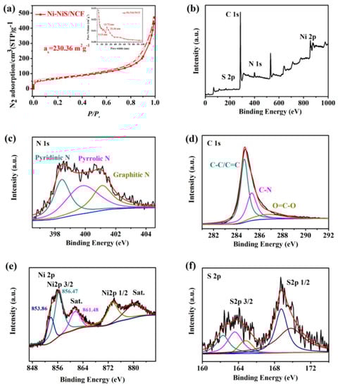 (a) Nitrogen adsorption and desorption isotherms of Ni-NiS/NCF; (b) total spectra of Ni-NiS/NCF; High resolution (c) N 1s XPS spectrum; (d) C 1s XPS spectrum; (e) Ni 2p XPS spectrum; (f) S 2p XPS spectrum.