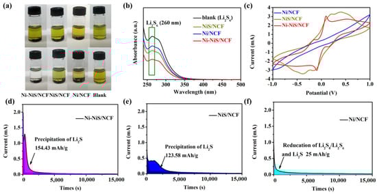 (a) Visual adsorption of Li2S6 with different materials; (b) UV absorption profile after adsorption of Li2S6; (c) the CV curves of symmetric cells with Ni-NiS /NCF, NiS/NCF, and Ni/NCF using Li2S6 as electrolyte. Time–current–time curve of 2.05 V constant voltage discharge on Ni/NCF. (d) NI-NIS /NCF; (e) NiS/NCF; (f) Ni/NCF.