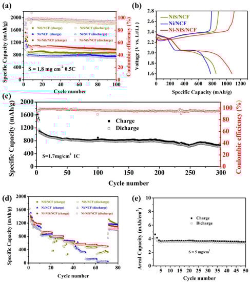 (a) Cycling performance of the cells with different separators at 0.5 C. (b) Charge and discharge curves of the cells with different separators at 0.5 C. (c) Long cycle performance of the cell with Ni-NiS/NCF-coated separator at 1 C. (d) Rate performance at different current densities for different cells. (e) Cycle performance of the cell with Ni-NiS/NCF-coated separator at 0.1 C with high sulfur load.