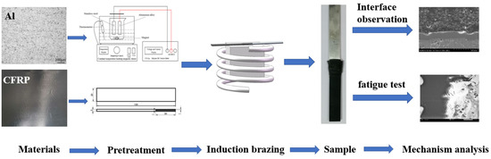 In the present work, induction brazing was used to joint CFRP plate and 5083 aluminum alloy plate to form a butt lap joint. The optimal process parameters were determined by the control variable method, and the interface connection mechanism was discussed. Through high-cycle fatigue testing of the CFRP/5083 joint, the fatigue limit and the fatigue fracture mechanism of the joint were also obtained and analyzed. Figure 2 shows the flow chart of joining process and mechanical property characterization.
