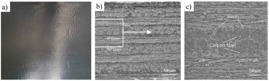 (a) Macro-morphology of CFRP; (b) micro-morphology of CFRP; (c) enlarged view in (b).