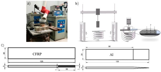 By applying an alternating magnetic field around the aluminum alloy sample, the CFRP plate and aluminum plate were connected through the induction brazing method (Figure 5). Meanwhile, a normal pressure was applied on the top of the CFRP plate during the induction brazing process to obtain a robust bonding between the CFRP plate and the 5083 P-O plate. Since the tensile strength of CFRP (550 MPa) is higher than that of 5083 P-O aluminum alloy (270 MPa), a groove with a width of 1 mm and a length of 30 mm was opened on the end plane of the CFRP plate (Figure 5c) to increase the contact area, thus increasing the bonding strength of the joint.