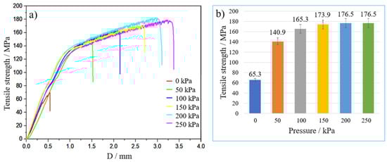 Tensile property of CFRP/5083 joints with different welding pressures. (a) Stress–displacement curves; (b) tensile strength of CFRP/5083 joints.