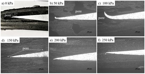 Figure 6 shows the tensile property of the CFRP/5083 joints with different welding pressure. It can be observed that the tensile strength of CFRP/5083 joints increased with the increase of welding pressure. When the pressure reached 200 kPa, the tensile strength of the joint reached the maximum value of 176.5 MPa. Figure 7 shows the cross-sectional morphologies of the joints. It can be observed from Figure 7a that the CFRP and 5083 aluminum alloy could hardly be connected when no normal pressure was applied. As the pressure increased, the forming quality of the joint became better and the pore size in CFRP decreased gradually. When the pressure reached 200 kPa, the porosity defect near the interface disappeared completely. At the same time, the tensile strength of the joint reached the maximum value. Based on the test results, the optimum initial welding pressure was determined to be 200 kPa.