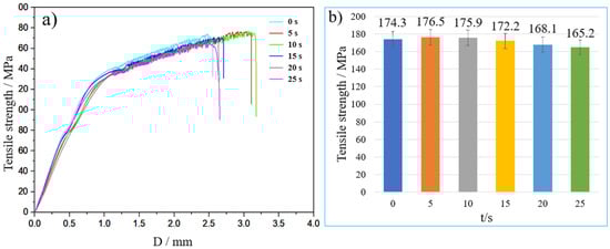Tensile property of the joints with different holding time. (a) Stress–displacement curves; (b) tensile strength of CFRP/5083 joints.
