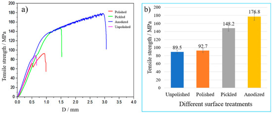 Subsequently, 5083 plates with different surface treatments (unpolished, polished, pickled, and anodized) were connected with CFRP plates to investigate the effect of surface states on the bonding behavior of the composite joints. The pickling was the last procedure of the anodizing pre-treatment process. In addition, the other processing parameters during the induction brazing process were fixed with an induction temperature of 290 °C, a holding time of 5 s, and a normal pressure of 200 kPa. Figure 9 shows the tensile property of the CFRP/5083 joints with different surface treatments. The tensile strength of joints with unpolished and polished 5083 plates was only about 90 MPa, while the tensile strength of CFRP/pickled 5083 plate and CFRP/anodized 5083 plate reached 148.2 MPa and 176.8 MPa, respectively. Therefore, anodization is an effective method to enhance the bonding strength of the CFRP/5083 joint.