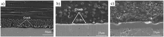 Figure 10 shows the interface morphologies of the CFRP/5083 joints with different surface treatments under a scanning electron microscope. It can be observed that there are no defects such as pores, cracks, and interface delamination in the CRFR layer, indicating that the induction brazing method can effectively protect the integrity of CFRP. Specifically, the resin at the interface could hardly be connected to the polished 5083 plate, and cracks could be clearly observed in Figure 10a. On the other hand, the bonding between the CFRP plate and the pickled 5083 plate was better due to the hackly surface of the acid-pickled 5083 plate [24], which was treated with alkaline etching and pickling. However, there were still some microcracks at the interface. After anodic oxidation, an oxide film was formed on the surface of the 5083 plate, and the anodized 5083 plate was firmly connected with the resin. Meanwhile, there were no microcracks or pores at the interface, which indicated that a sound bonding was achieved between the CFRP plate and the 5083 plate.