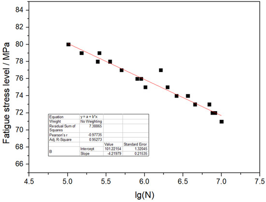 High-cycle fatigue (HCF) testing was carried out with a stress ratio of 0.1 and a frequency range of 60–85 Hz at room temperature and air condition. The number of fatigue cycles experienced by each CFRP/5083 induction brazed joint at different stress levels before fatigue fracture is shown in Figure 11. The S-N curve of CFRP/5083P-O induction brazed joint under this condition is obtained by linear fitting the points in the figure. The formula of the fitted S-N curve is expressed as:
