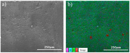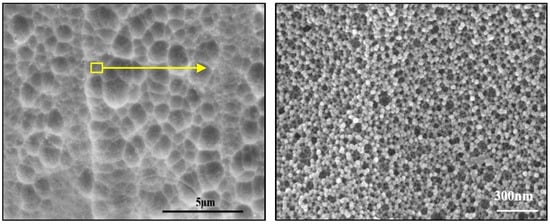 Figure 13 shows the surface morphology of the anodic oxide film on the surface of the 5083 plate under a scanning electron microscope. At the micrometer scale, the surface morphology of the anodic oxide film presents an undulating cellular structure. At the nanometer scale, the surface morphology of anodic oxide film presents a hexagonal porous structure with uniform distribution. Meanwhile, the chemical composition of the fracture morphology of the CFRP/5083 joint after static tensile test is shown in Figure 14. It could be observed that the C element in CFRP was evenly distributed in the pores on the surface of the oxide film, which was in accordance with the previous interface morphology. It is proved that the loose and porous structure of the anodic oxide film is conducive to the formation of robust bonding between CFRP plate and 5083 plate, thus enhancing the mechanical properties of the CFRP/5083 joint.
