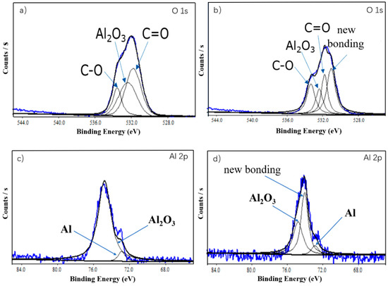 In order to further understand the effect of anodization on the bonding behavior and strength of the CFRP/5083 joint, X-ray photoelectron spectroscopy (XPS) [25,26] was performed on the interface of the CFRP/5083 joint, and the results are shown in Figure 15. Figure 16a is the fitting diagram of O (1 s) peaks at the interface without anodization before induction brazing. The bond energy of 531.79 eV, 532.39 eV, and 534.19 eV corresponded to PA6 (C=O), Al2O3 (Al–O), and PA6 (C–O), respectively. Figure 15b is the fitting diagram of the O (1 s) peaks of the interface of CFRP/5083 joint with anodization. It can be clearly observed that the interface contained not only the diffraction peaks of C–O, C=O, and Al–O, but also a new bond energy, which was neither CFRP nor anodized Al. Similarly, by comparing the diffraction peaks in Figure 15c,d, it could be concluded that a new bonding was formed after the 5083 plate was anodized. According to the variation of the bond energy of the CFRP/5083 interface before and after anodization, and the chemical formula structure of PA6 (–[NH–(CH2)5–CO]n–) [8,27], it can be inferred that Al–O–C chemical bonds were formed at the interface [27]. Therefore, the interface of the CFRP/5083 joint without anodizing treatment only presents mechanical bonding. After the surface of the 5083 aluminum alloy was anodized, the loose and porous structure of the oxide film not only increased the mechanical bonding strength of the interface, but also led to the formation of a new bond at the CFRP/5083 interface, which enhanced the bonding strength of the joint.