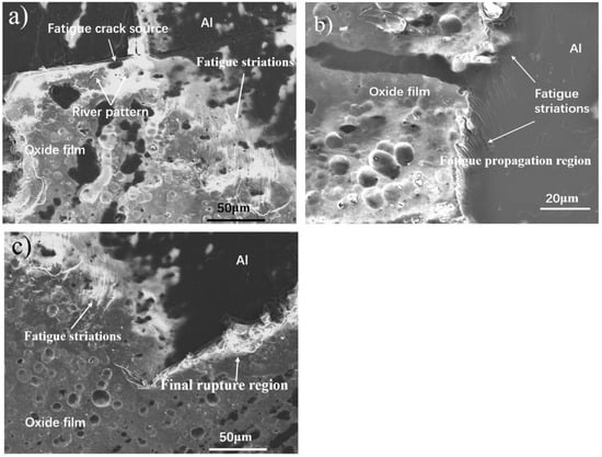 Figure 16 shows SEM images of the fracture surface of CFRP/5083 joint after the HCF test at 80 MPa stress levels. The figure shows the whole process of fatigue crack, including crack initiation stage, crack growth stage, and the final instant fracture. In Figure 16a, the location of the fatigue source (a hole in the oxide film) can be found through fatigue striations and river patterns, which are unique fracture morphology features during the fatigue process [28,29]. The fatigue source is mostly located in the position of pores or inclusions, as cracks are prone to initiate from defects area due to stress concentration. Similarly, the fatigue cracks of this sample also originated from the holes on the surface of the anodic oxide film. Figure 16b shows the fatigue propagation region. It can be seen that fatigue striations extend along the oxide film section and the aluminum alloy surface. It can be inferred that fatigue cracks grow along the oxide film section. Figure 16c shows the fatigue final rupture region. The fatigue striation stopped extending here. At the same time, the remaining oxide film section in the field of vision exhibited the characteristics of brittle fracture. It can be inferred that instant fracture occurred in this region.
