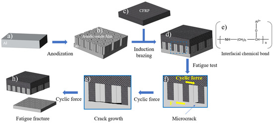 In order to further demonstrate the jointing mechanism and fatigue fracture process of CFRP/5083 joints, Figure 17 illustrates the connection mechanism and fracture process of the joint. For CFRP/polished 5083 joint, it was difficult to remove the remaining impurities in the grooves since the surface was only physically treated. The impurities between CFRP and 5083 aluminum base metal hindered the connection between CFRP and aluminum alloy, resulting in a low interfacial bonding strength. However, the pickling process (etched by NaOH and HNO3) not only effectively removed the original oxide film and impurities on the surface of the 5083 plate, but also refined the surface micro-structures, leading to the formation of a stronger mechanical interlocking structure and increasing the interface bonding strength of CFRP/5083 joint. After the surface of the 5083 plate was anodized, a layer of regular loose and porous structure was formed on the surface of the 5083 plant (Figure 17b). During the brazing process between CFRP and aluminum alloy, the melted resin flows into the loose holes of the oxide film under the pressure, forming a strong mechanical bond (Figure 17d). At the same time, XPS analysis showed that a new chemical bond was formed between the resin and the anodized film (Figure 17e), which further enhanced the bonding strength of the interface between CFRP and aluminum alloy.