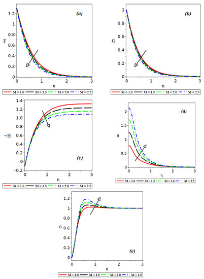 Figure 2a–e depict the effect of magnetic parameter on the functional dependence of the flow components, temperature and concentration distribution on the dimensionless variable . In an electrically conducting fluid, a drag force, which is essentially a resistive force, is produced by the magnetic field. This resistive force tends to reduce the movement of fluid and increase the temperature on the surface of the disk. This explains the decrease in the values of radial , azimuthal and the magnitude of the axial velocity seen in Figure 2a–c. The increase in the temperature and mass concentration of the fluid is shown in Figure 2d,e.