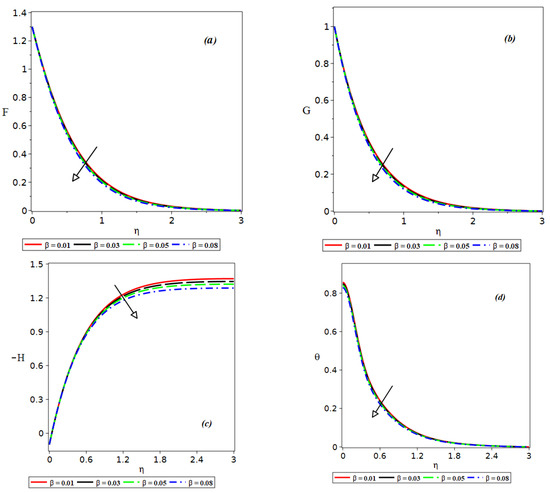 Figure 3a–c show the effect of the Deborah number on velocity components in radial, azimuthal and axial directions. These figures show a decrease in all three velocity components as the value of the Deborah number is increased. As a result, the hydrodynamic boundary layer thins out. Increasing the value of causes the fluid to behave more like a solid, causing the decrease in the velocities . The effect of the Deborah number on temperature distribution is displayed in Figure 3d, where it can be seen that the temperature decreases with the increasing
