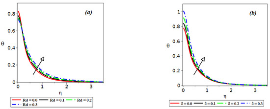 An increase in the thermal radiation parameter, as can be expected, results in an increase in the temperature of the liquid, as seen in Figure 4a. To maintain the heat transportation in the liquid, heat source/sink effects are applied. As seen in Figure 4b, an upward shift in the temperature profile is shown as the values of increase from 0.0 to 0.3.